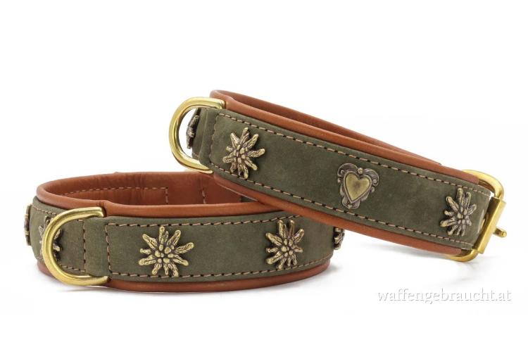 Mit dem Modell „Bergzauber“ bietet die Maul-Ledermanufaktur ein hochwertiges Halsband im traditionellen Alpenstil. Die Kombination aus edlem Khaki, warmem Cognac-Leder und stabilen Messingbeschlägen verleiht dem Halsband einen charakterstarken, natürlichen Look. Eine abgesetzte Kontrastnaht rundet das Design stilvoll ab und unterstreicht die handwerkliche Verarbeitung. Das verwendete Leder ist besonders weich und anschmiegsam, sodass Ihr Hund höchsten Tragekomfort genießt – auch bei täglichem Einsatz. Gleichzeitig sorgt die robuste Verarbeitung für Langlebigkeit und Formstabilität. Die alpenländisch inspirierten Zierelemente machen „Bergzauber“ zu einem besonderen Accessoire für anspruchsvolle Hundebesitzer. Ob auf der Alm, im Wald oder in der Stadt – mit „Bergzauber“ setzen Sie auf Qualität, Funktion und stilvolles Design.