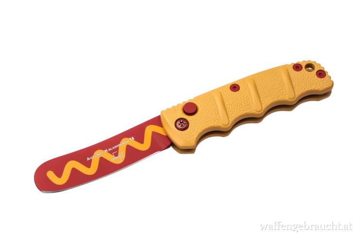 Der Böker Plus BHQ AKS-74 Mini Wiener Warrior bereichert unsere geliebte Kalashnikov-Serie um eine leckere Hot Dog-Version. Der gelbe Aluminiumgriff erinnert an frische goldgelbe Semmel.