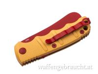Die rote, mit Senf verzierte Klinge des Automatikmessers besteht aus rostfreiem D2-Stahl und öffnet wie gewohnt per Druckknopf.