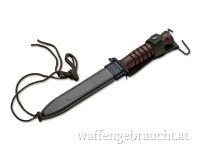Das charakteristische Parierelement verhindert ein ungewolltes Abrutschen auf die Klinge. Die Fehlschärfe im Klingenrücken reduziert nicht nur das Gewicht und perfektioniert die Balance des Messers, sondern unterstreicht auch die klare Linienführung. Mit authentischer U.S. M8A1-Scheide und individueller Seriennummer.
