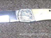 Zum Verkauf kommt ein Klappmesser mit weißem Griff und Ledertasche.