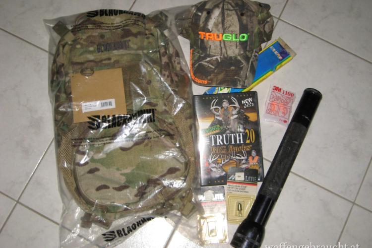 1 Stk. Blackhawk-Rucksack Camo, 1 Stk. Kappe Camo, 1 Stk. Polizeistablampe 4 Cell inkl. 3 Ersatzbirnen (gebraucht), 1 Stk. Schleifstein, 1 Paar Ohrenstopsel, 1 Stk. Bogensport DVD, € 50,-- Bei Fragen Handy Nr. 0676 9373888