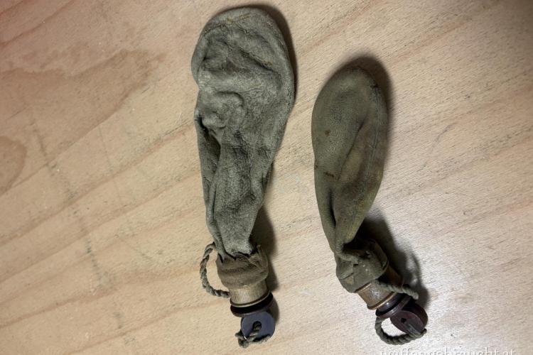 2 Stück Schrotbeutel, Leder, mit Holzverschluß, vermutlich vor 1900; Altersbedingte Gebrauchsspuren, aber augenscheinlich ohne Bewchädigungen (siehe Foto).